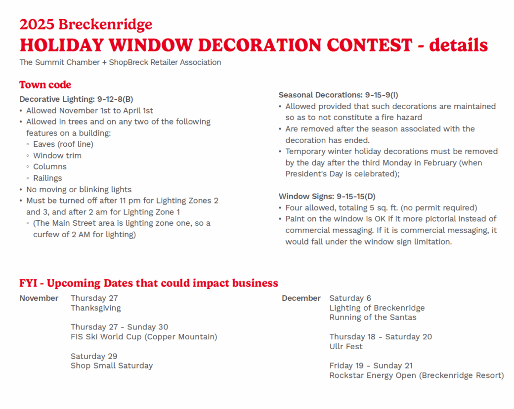 Enter Today! The Summit Chamber and ShopBreck Retailer Association invite YOU to showcase your business and get into the holiday spirit by decorating and lighting up your storefront or restaurant windows.